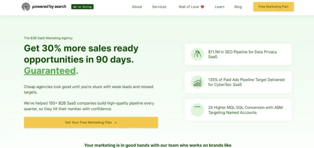 Founded in 2009, Powered by Search is a digital marketing consultancy enterprise that is focused on boosting the growth rate of B2B technology and SaaS firms that have been showing slow growth. The agency is doing well in demand generation, content marketing, paid ads and SEO with unique guarantee of delivering actual results within 90 days. Clients enjoy the direct engagement approach at Powered by Search, which gets them to specialised consultants without the normal account management levels that are presented in regular agencies.
